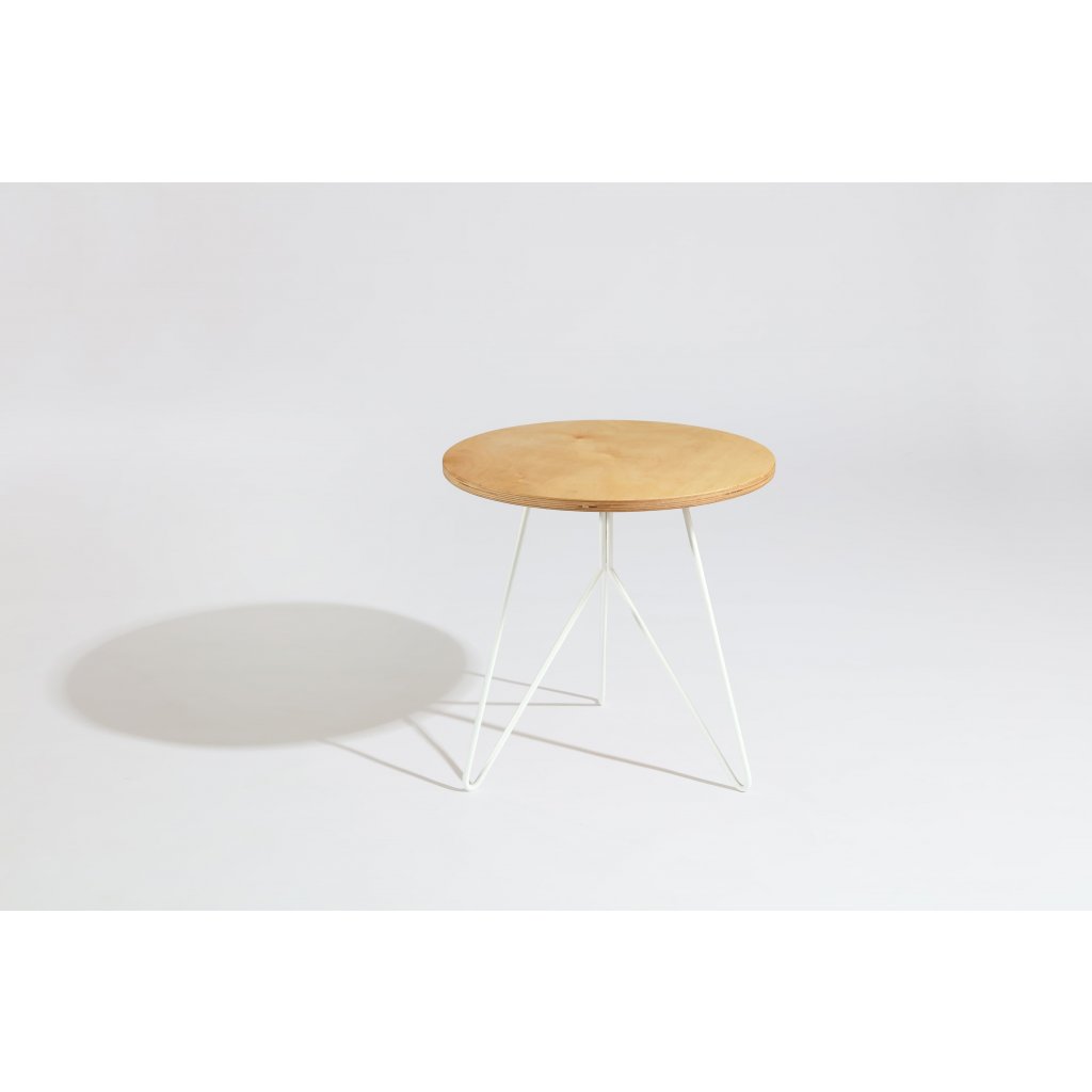 Tento stůl se může pochlubit krásnou deskou z březové překližky, která byla pečlivě ošetřena voskovým olejem, což zajišťuje její odolnost a dlouhou životnost. Jeho bílá kovová podnož zase dodává stolu lehkost a moderní vzhled.