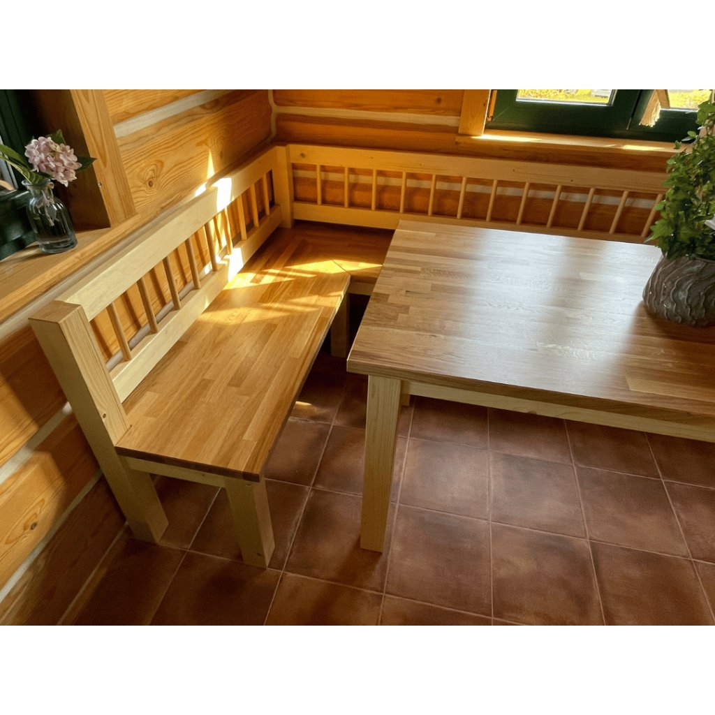 Lavice s rozměry 140 x 45 x 180 cm je skvělým doplňkem pro pohodlné posezení. Stejně jako stůl má tloušťku desky 3 cm a povrchovou úpravu tvrdovoskovým olejem, což zajišťuje harmonii a jednotný vzhled celé sady.