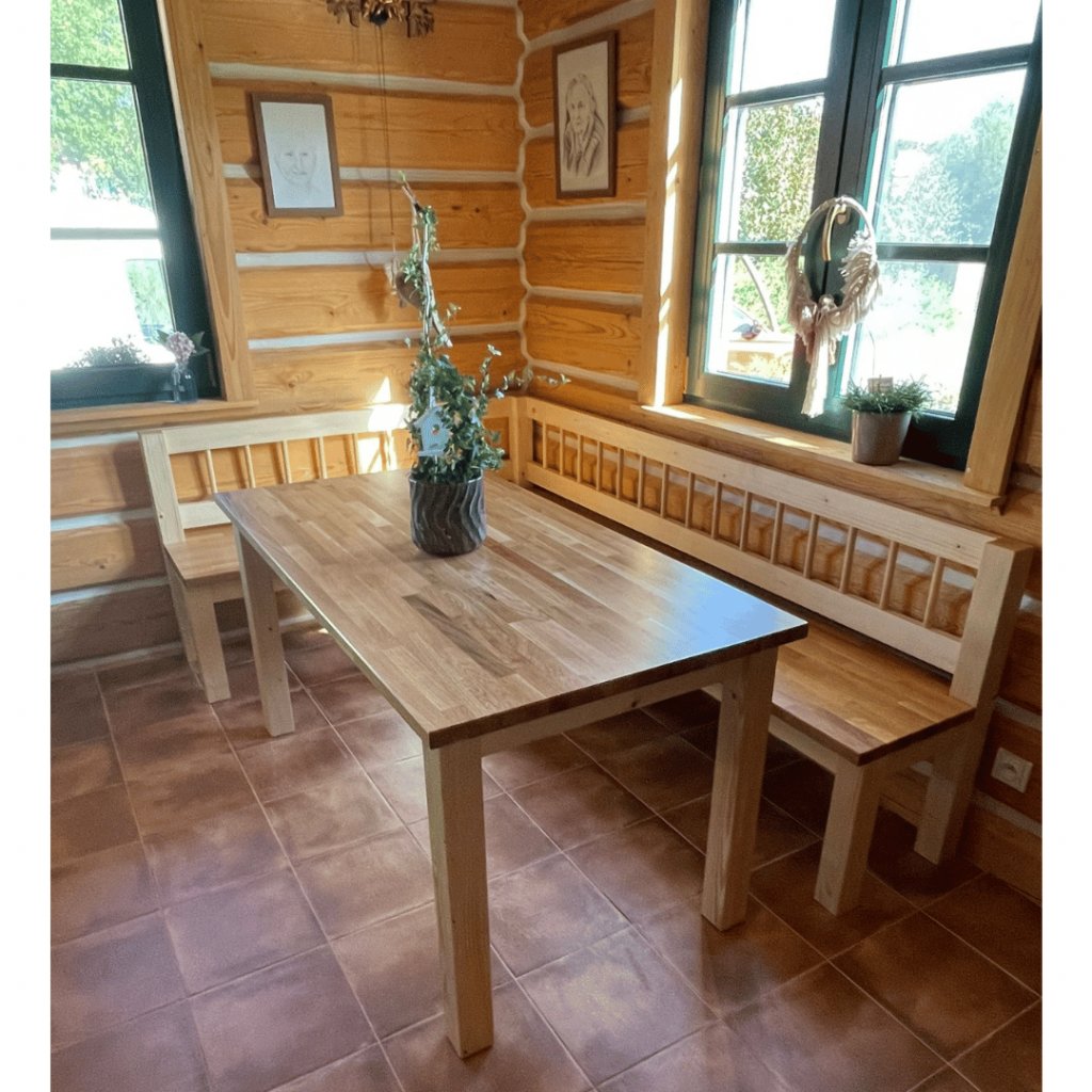 Naše sada jídelního stolu a lavice spojuje luxusní design a kvalitní řemeslnou práci. Materiály z dubové cinkované spárovky poskytují nejen odolnost, ale i přírodní krásu do vašeho interiéru.